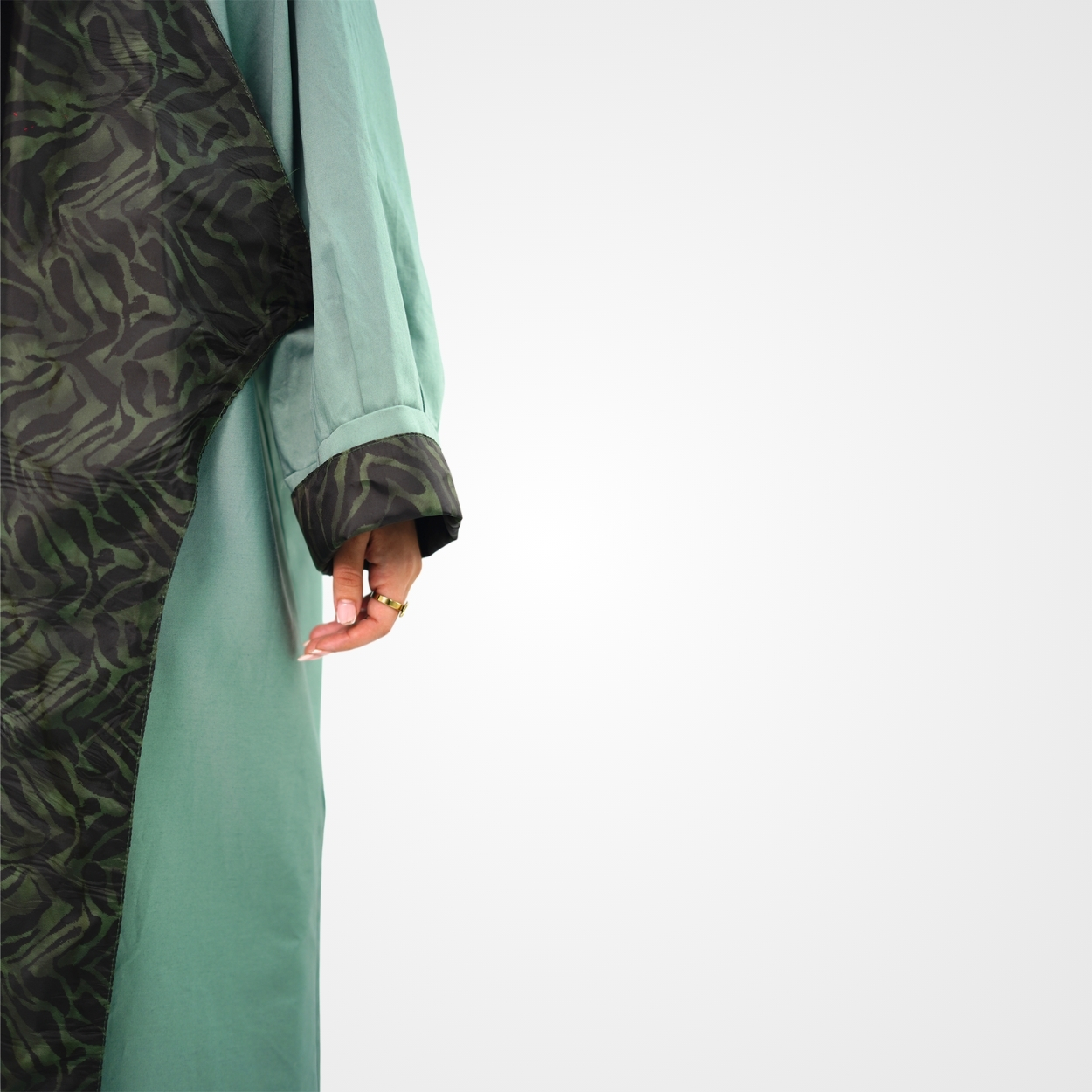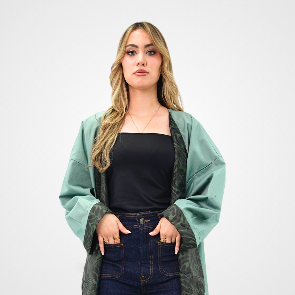 Ce kimono long se distingue par son élégant coloris vert sauge et ses larges revers contrastés à motif zébré noir et vert forêt. Sa coupe oversize aux manches amples et tombantes crée une silhouette fluide et moderne, parfaite pour rehausser une tenue décontractée ou sophistiquée.