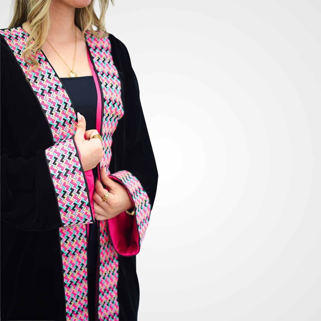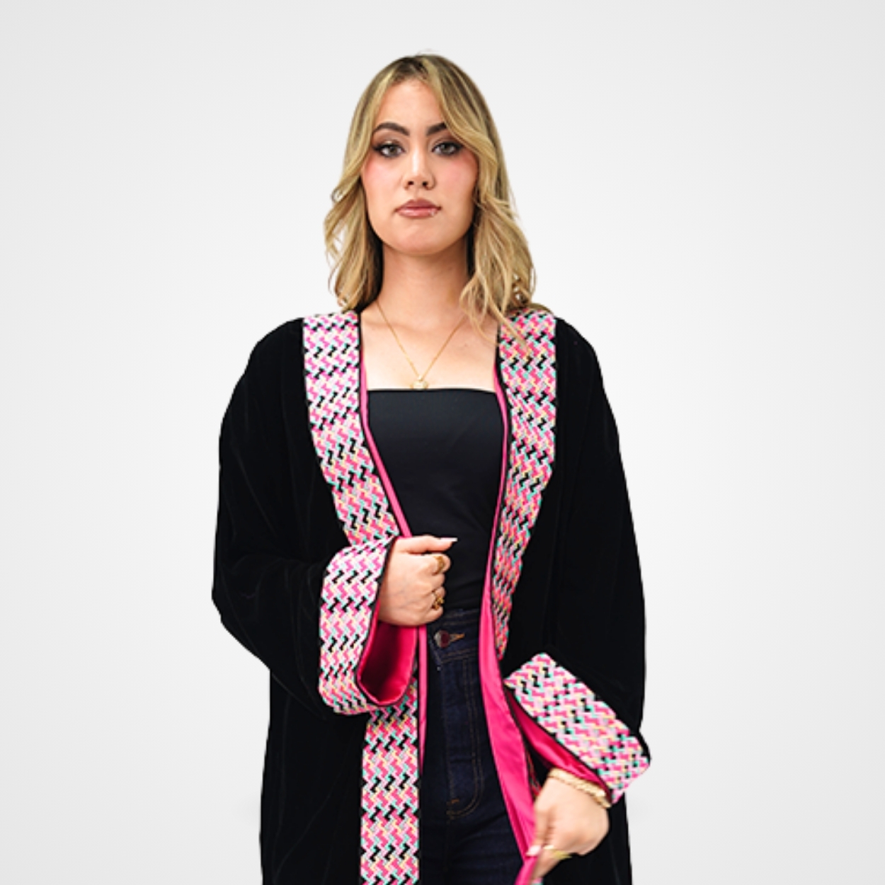 Osez l’élégance audacieuse avec ce Kimono en Velours Noir aux finitions Satin Fuschia. Un contraste vibrant souligné par des broderies géométriques modernes, idéal pour structurer vos tenues avec éclat et caractère.