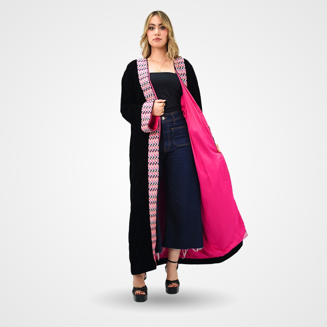 Le Contraste Haute Couture Ce kimono long réinvente le classique noir par une touche de couleur électrisante. Sa doublure en satin rose fuschia apporte une luminosité instantanée à chaque mouvement, créant un look à la fois chic et dynamique.