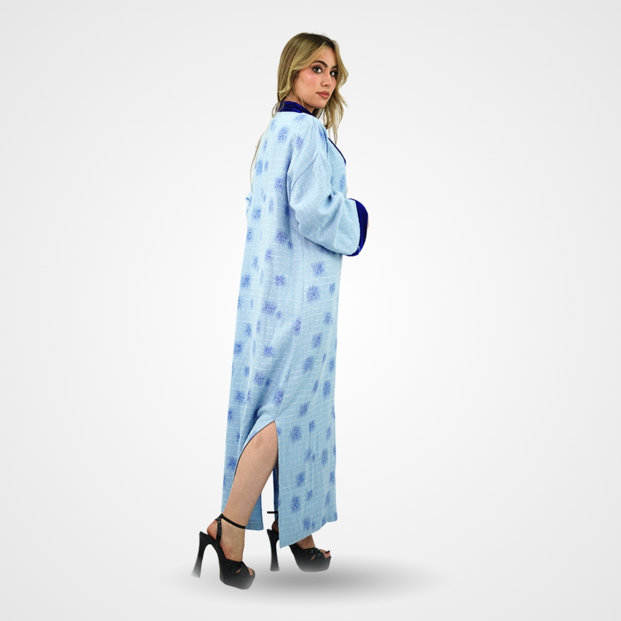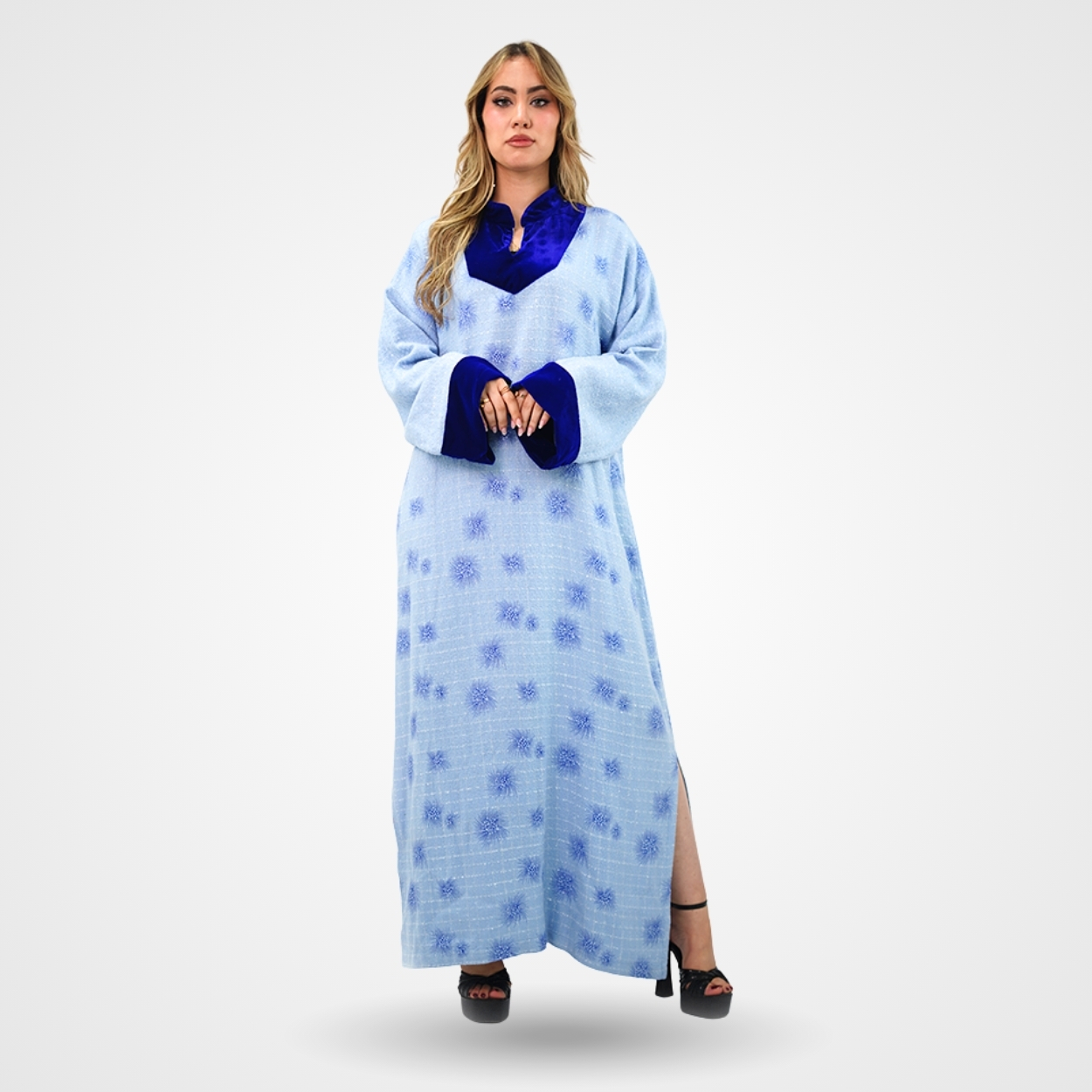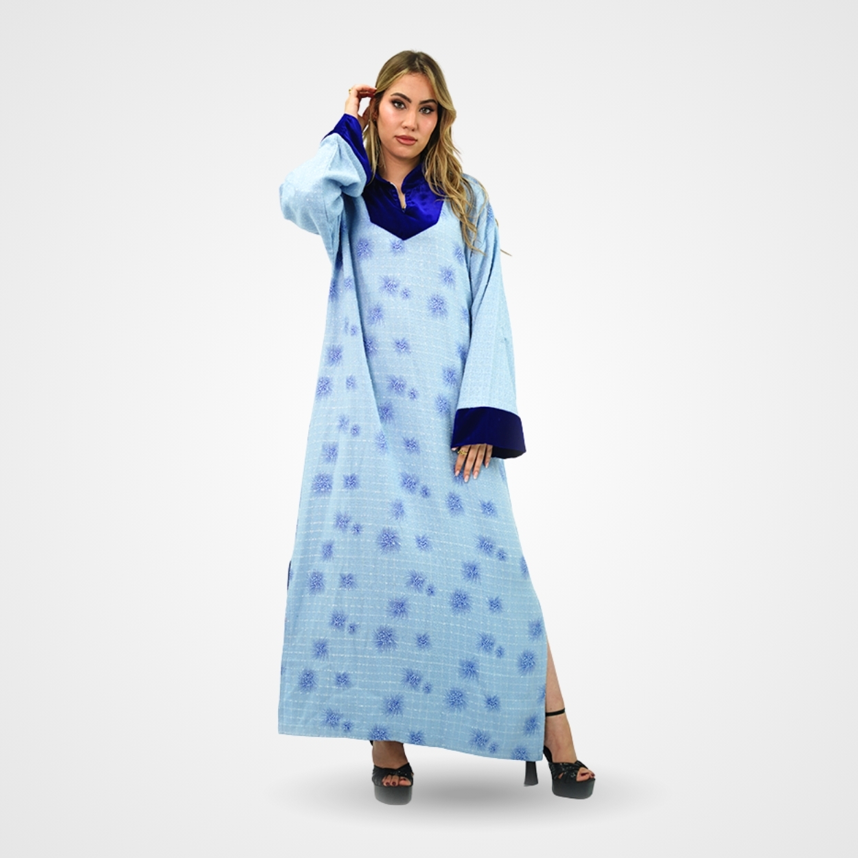 Cette djellaba d’hiver est confectionnée dans un lainage bleu ciel texturé, parsemé de motifs brodés en relief dans un camaïeu de bleus pour un effet visuel à la fois riche et chaleureux. Sa silhouette est structurée par un contraste de matières noble, où l’encolure en « V » et les larges revers des manches sont travaillés dans un velours bleu royal profond, apportant une touche de noblesse à l’ensemble. Les finitions soignées du col et des poignets témoignent d’un savoir-faire artisanal qui transforme ce vêtement traditionnel en une pièce de mode hivernale sophistiquée.