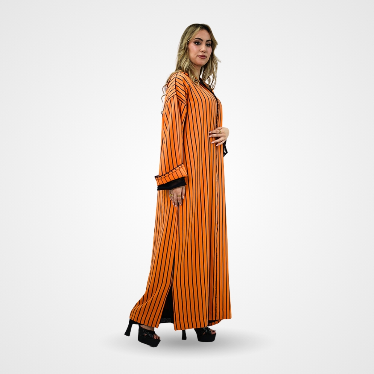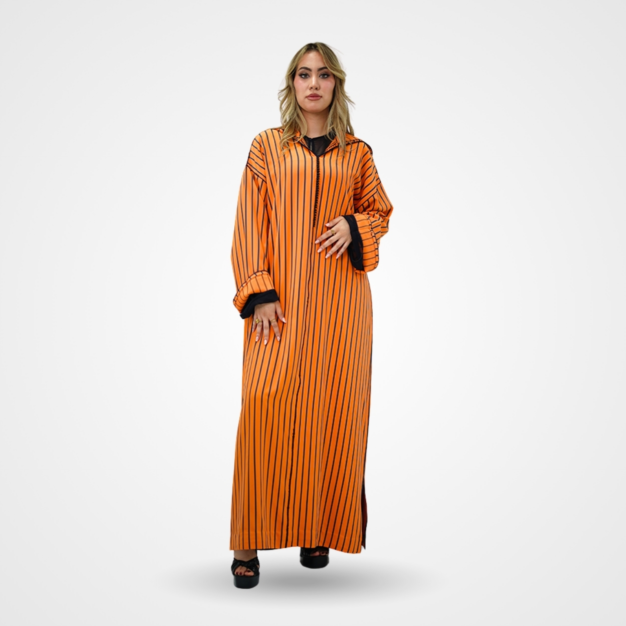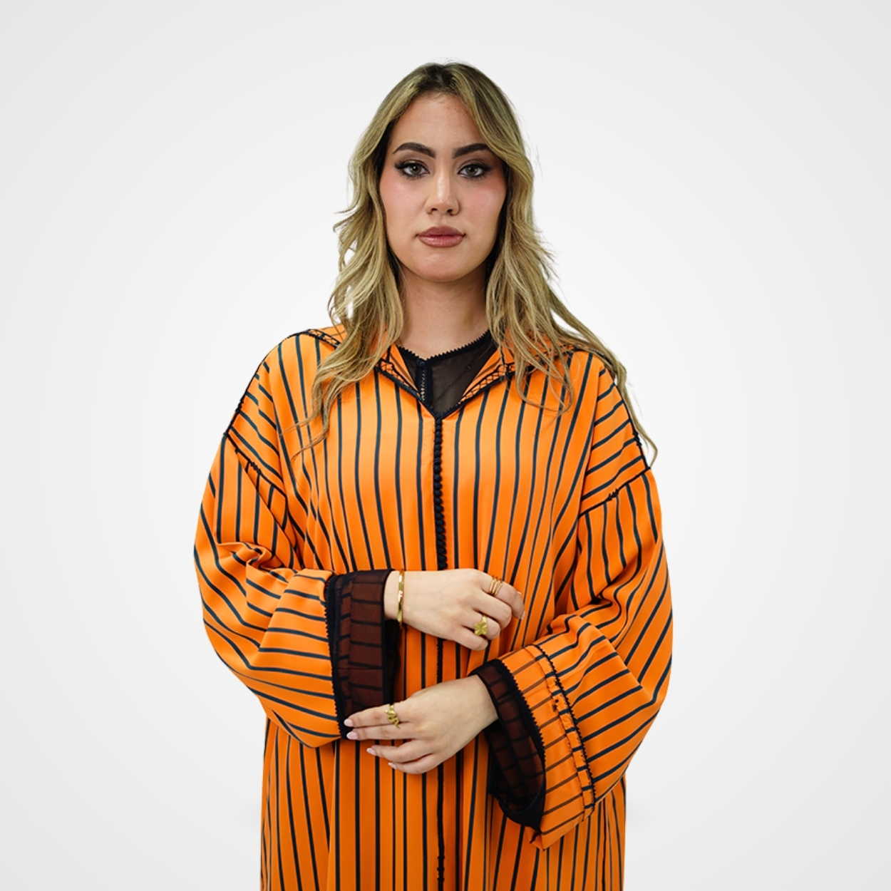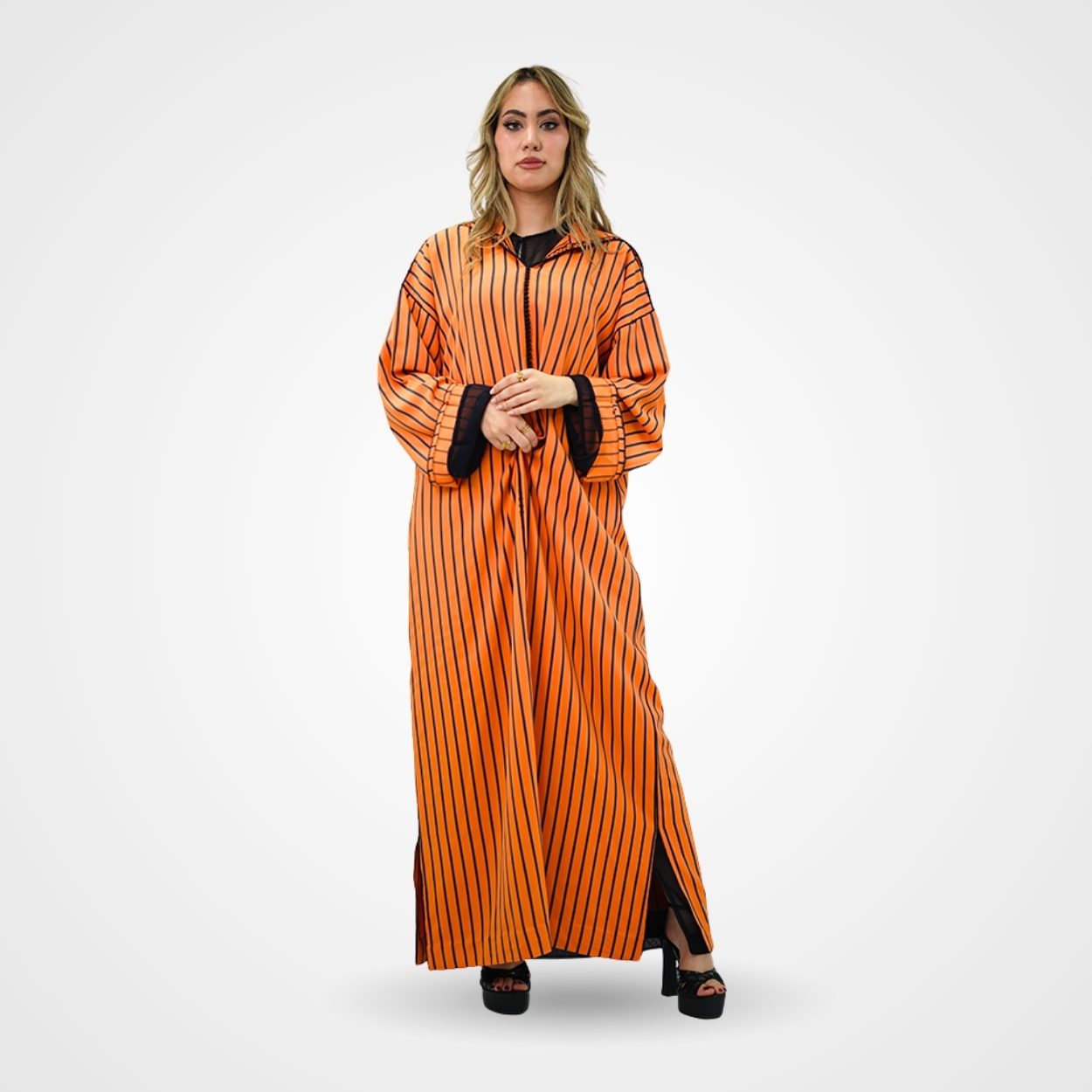Cette djellaba contemporaine d’un orange mandarine éclatant est une véritable ode à la lumière et à l’énergie. Rythmée par de fines rayures verticales noires, sa coupe fluide allonge majestueusement la silhouette tout en lui offrant une profondeur graphique très « couture ». Le contraste est accentué par des finitions sombres, notamment une sfifa délicate et des revers de manches en tulle noir qui apportent une touche de transparence moderne et sophistiquée. C’est une pièce de caractère, à la fois solaire et audacieuse, qui réinvente le patrimoine avec un esprit résolument avant-garde.